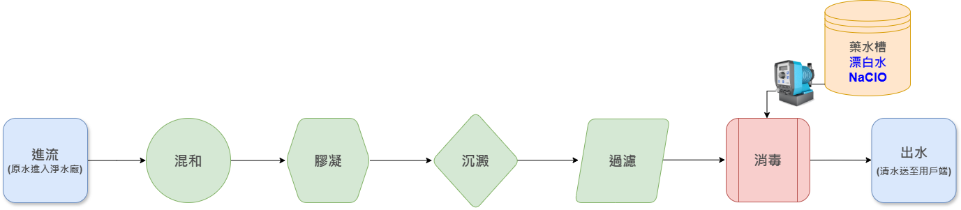來自水庫或其他水源的原水進入淨水場後經過混和、膠凝、沈澱、過濾、消毒等淨水程序,在消毒程序中,透過Sera可控電磁式定量泵浦C 204.1添加漂白水(次氯酸鈉),確保去除所有病菌及雜質,使其符合飲用水標準後,輸送至各家戶中。
