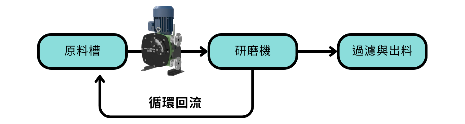 在一去角質乳液的製程研磨系統中,Verderflex 軟管泵浦 Dura系列將含磨砂顆粒的乳液從儲槽抽送至奈米珠磨機進行細化分散,再將其循環回流至儲槽,直到達到所需粒徑分佈與質地。