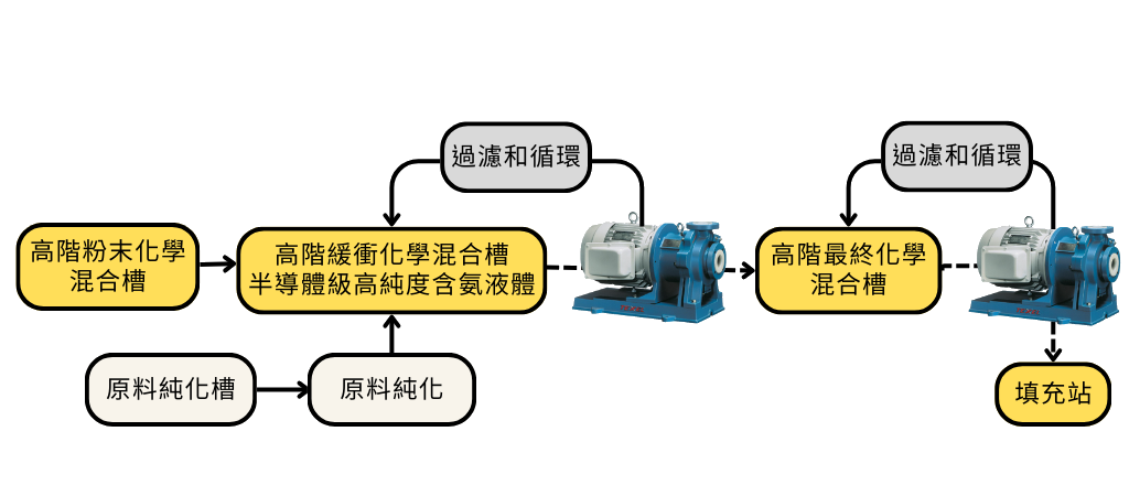 光刻輔助劑屬於高純度含氨液體,對輸送設備的材質選用與設計結構要求甚高。為確保整體製程的化學液均勻性與穩定性,製程初始會先在高階粉末化學混合槽中進行預混,使粉體充分分散, 接著導入高階緩衝化學混合槽與高純度含氨液體進行精密比例調製。