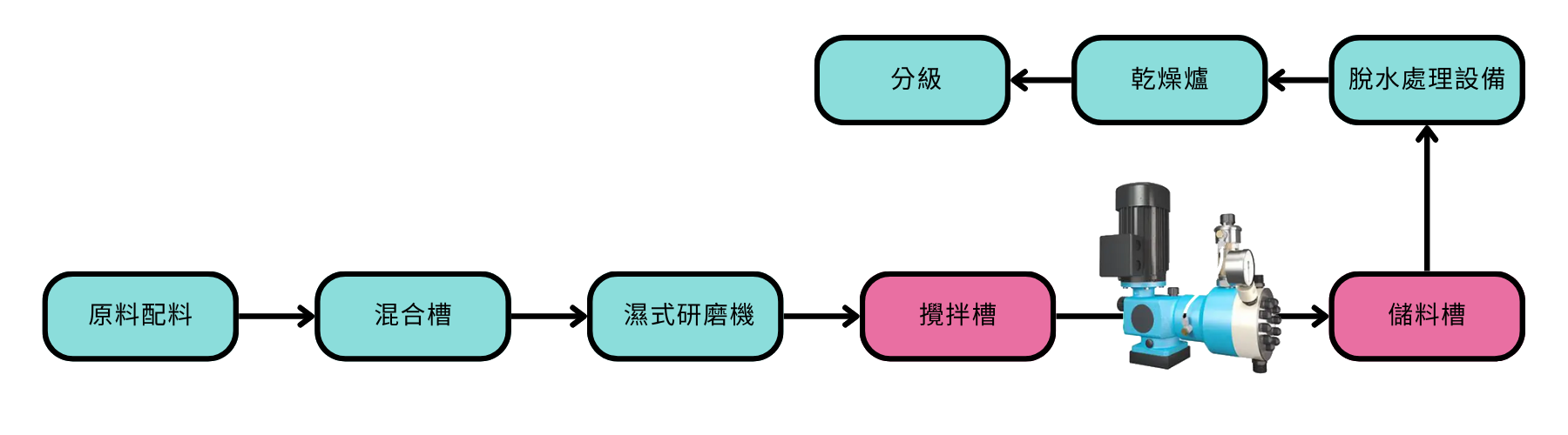 整體製程從原料配比開始,經過濕式研磨與均質混合後形成磁粉漿料。這類漿料具有高磨蝕性與不穩定的流動性,若無適當泵浦設備,極易造成輸送不均或設備磨損。SERA油壓定量泵以其精準定量、抗腐耐磨、無脈衝輸送的特性,有效克服傳統泵浦面對磁粉漿料輸送時的種種挑戰。