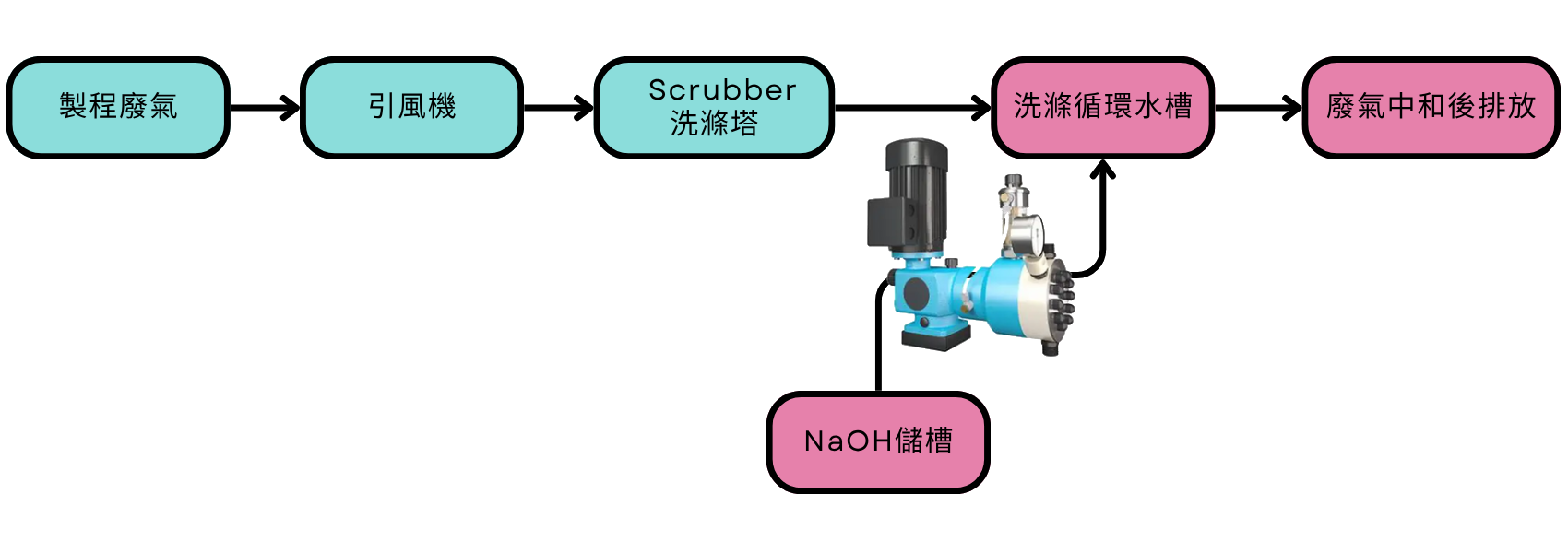 半導體製程中,如蝕刻、清洗、鍍膜等步驟會產生大量含酸性或有害氣體(如 HF、HCl、Cl₂、NH₃ 等)。為了達到環保排放標準,工廠會設置Scrubber 空氣洗滌系統,以液體吸收方式進行廢氣中和與過濾處理。其中,NaOH 45% 高濃度鹼液是常見的中和劑,能與酸性氣體發生中和反應,生成無害鹽類或水。為確保 Scrubber 效能穩定,須持續將 NaOH 精準注入循環水系統中,維持系統內 pH 值於最佳反應範圍。