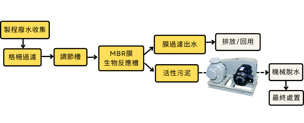 核心處理單元為MBR膜生物反應槽,結合活性污泥法與膜分離技術,能高效去除有機污染物並獲得高品質出水。在此過程中,反應槽內會產生大量高濃度活性污泥,必須穩定排送至後段脫水設備。(圖三)
