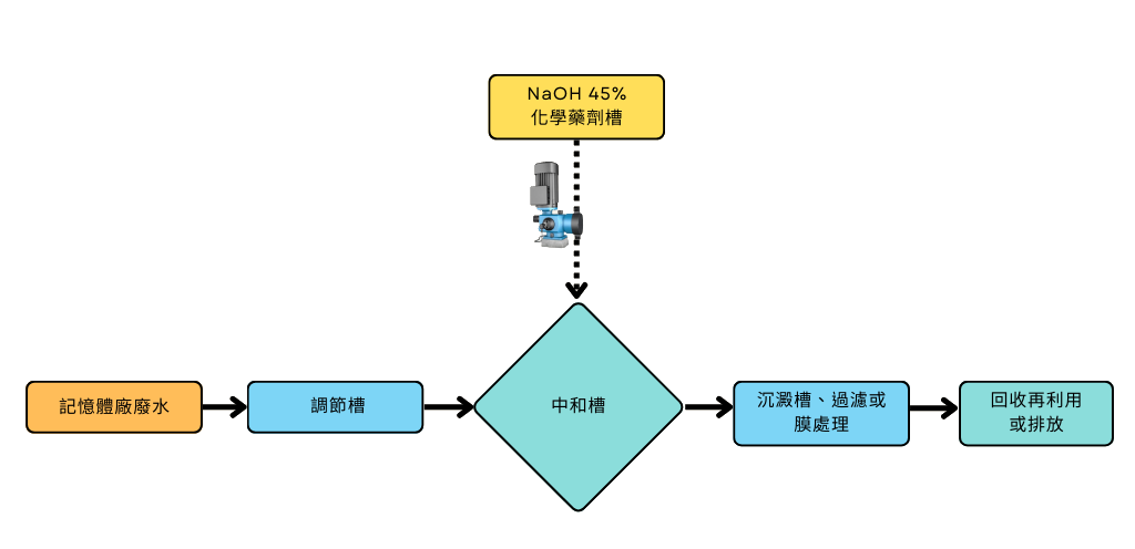 在電子及半導體產業的記憶體廠,工廠製程中產生的酸性或含重金屬廢水會通過管道收集至調節槽,再將 NaOH 45% 藉由定量泵浦輸送至中和槽,pH 感測器監測廢水的酸鹼度,通過自動控制系統調整 NaOH 的投加量,確保 pH 值達到標準(如 6~9),並在混合槽內均勻攪拌以保證藥劑充分反應。最後,經過 pH 調整後,廢水進一步進入沉澱槽、過濾或膜處理單元,進行回收再利用或排放。