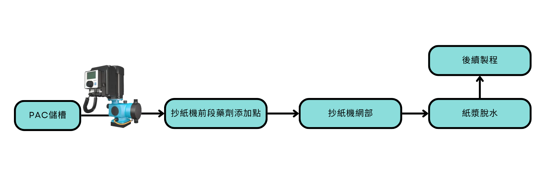 在造紙廠的抄紙系統中,為提升紙漿的脫水效果及成品質量,於抄紙系統內加入聚氯化鋁(PAC)作為助留劑及凝集劑。PAC藥劑可有效促進細小纖維與填料的留著,改善紙頁形成,同時提高水循環系統中的水質穩定性。該藥劑通常儲存於專用藥劑槽中,由SERA 機械式膜片定量泵浦 C 409.2 e Pro/Pro+ 系列準確計量並穩定輸送至紙機抄紙段的投加點。透過精準控制PAC的加藥量,可避免藥劑浪費及過量投加對紙漿品質造成影響。此泵浦具備耐腐蝕設計及穩定輸送性能,可長時間於腐蝕性環境中穩定運行,確保藥劑穩定添加,進一步提升整體製程效率與成品質量。