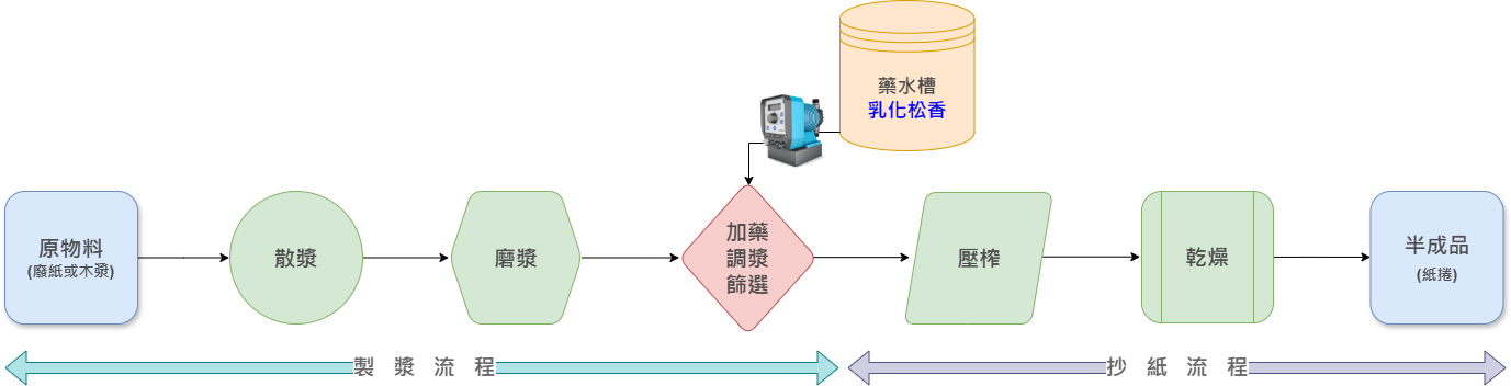 造紙流程中,原物料(廢紙或木漿)經過散漿、磨漿、加藥、調漿、篩選等製漿流程後,進入抄紙流程:經壓榨、乾燥後,最終產出半成品(紙捲),後續依需求進行裁切成紙張或紙板。