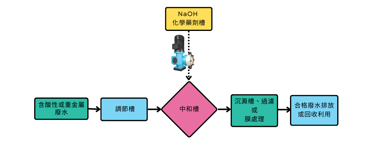 廢水首先由生產線收集,經初步過濾去除大顆粒雜質後, 導入中和槽進行pH值調整, 於此階段,Sera機械式膜片定量泵浦 RF 410.2 e 系列負責精準輸送 NaOH。經過精密加藥後,廢水進入混凝沉降系統,去除懸浮固體與重金屬,最後進行後續處理或回收再利用 。