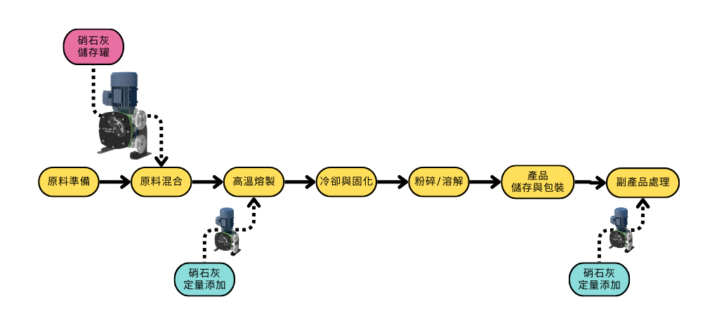 🔹 可能應用點: 若需在水玻璃溶解過程中調整 pH 值,可使用軟管泵浦計量輸送硝石灰溶液。