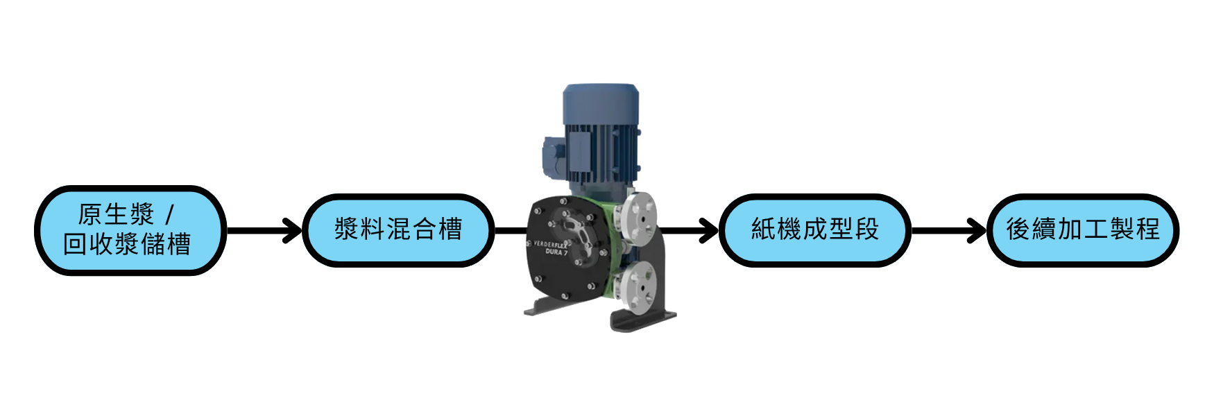 在此步驟中,採用Verderflex 軟管泵浦 Dura系列,將暫時性濕強劑以穩定且精準的流量輸送至漿料混合槽。由於濕強劑具有一定的黏稠度與化學性質,選用耐腐蝕、耐磨耗且易於維護的軟管泵浦,能確保製程穩定與設備壽命。