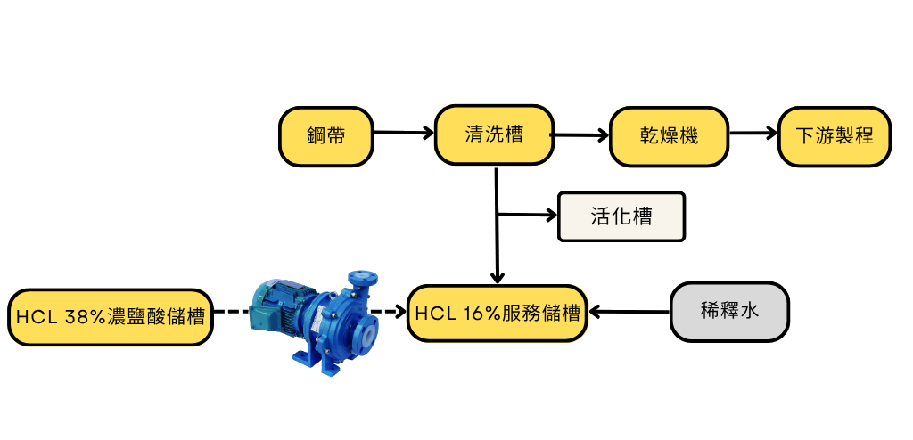 本製程中,HCl 38% 濃鹽酸先儲存在儲槽中,再經稀釋與調配後進入 HCl 16% 服務儲槽,提供清洗槽與活化槽穩定的清洗用酸液來源。 SEIKOW 無軸封泵浦 MER-051 安裝於濃鹽酸儲槽出口,負責高濃度HCl的穩定輸送與系統調配,確保整體酸液供應不中斷。