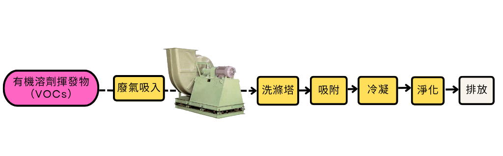 廢氣處理系統:這些廢氣隨後進入專門的廢氣處理設施,如吸收塔、洗滌塔或冷凝回收,在此過程中,氣體將依序經過吸收/中和、過濾與VOCs 去除或回收等處理步驟,確保排放符合環保標準。
