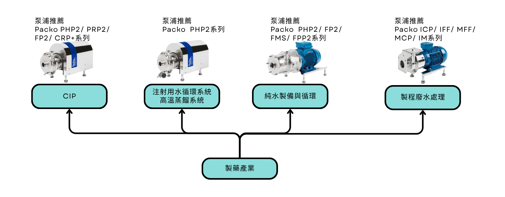 無菌應用:純化水製備、純化水循環、CIP 清洗系統、蒸餾系統 (注射用水製備)、廢水處理 | 製藥產業-輸送純化水、注射用水、清洗液與廢水:Packo 食品衛生級不鏽鋼離心泵浦系列