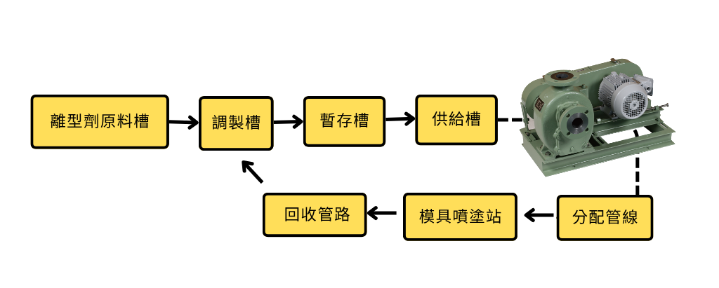 為確保離型劑能穩定輸送至模具供應系統,生產線普遍配置專用的輸送與循環系統。該系統需具備自吸能力強、通過固體能力高、可長時間連續運轉等特性,以避免氣阻與堵塞風險,同時降低設備維護頻率。