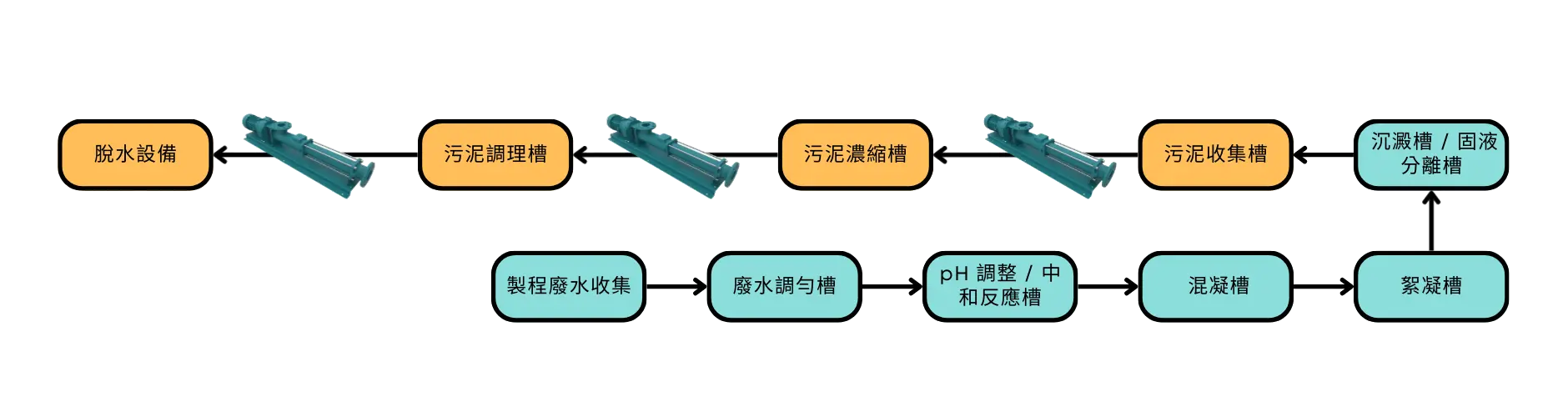 分離出的污泥會依系統配置進一步送往污泥收集槽、污泥濃縮槽、污泥調理槽及後端脫水設備,如板框壓濾機等,以降低含水率並形成便於清運處理的泥餅。由於半導體廠污泥通常具有高含固、黏度高、易沉降,且可能含有細微磨耗性顆粒等特性,因此在輸送過程中,泵浦不僅需要具備穩定輸送能力,也必須兼顧低脈衝、低剪切及良好的介質適應性,以避免堵塞、流量不穩或影響後端脫水效率。