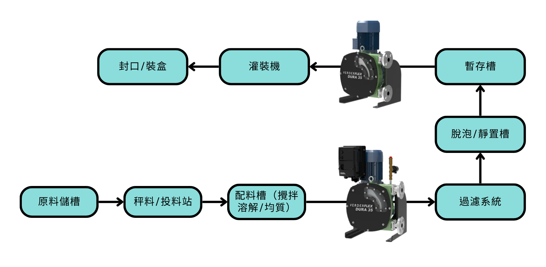 在此段「配料槽→過濾 &暫存→灌裝」的輸送環節,使用 Verderflex 軟管泵浦 Dura系列可將面膜液以穩定流量、低剪切方式輸送,避免破壞配方結構或引入額外污染。由於蠕動泵以軟管為唯一接液部件,可有效降低交叉污染風險,並可透過轉速調整流量,讓過濾與灌裝端的供料更平穩,提升產品一致性與生產良率。