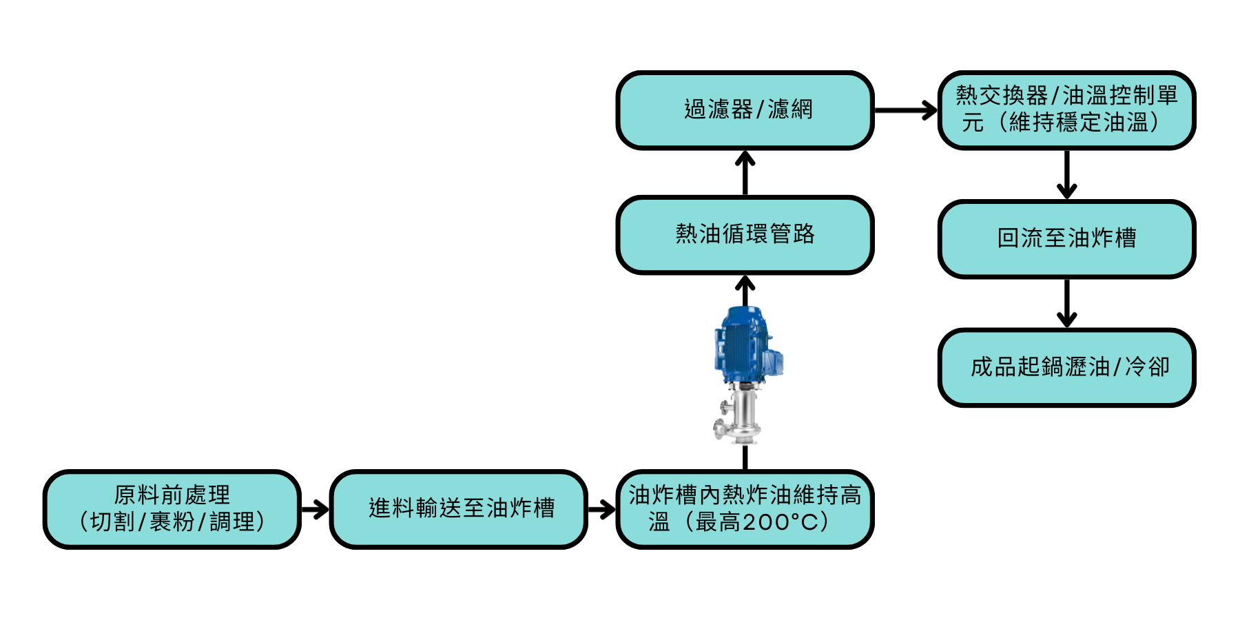 穩定循環、提升油炸品質一致性:協助維持油溫均勻、循環效率佳,降低產品批次差異。