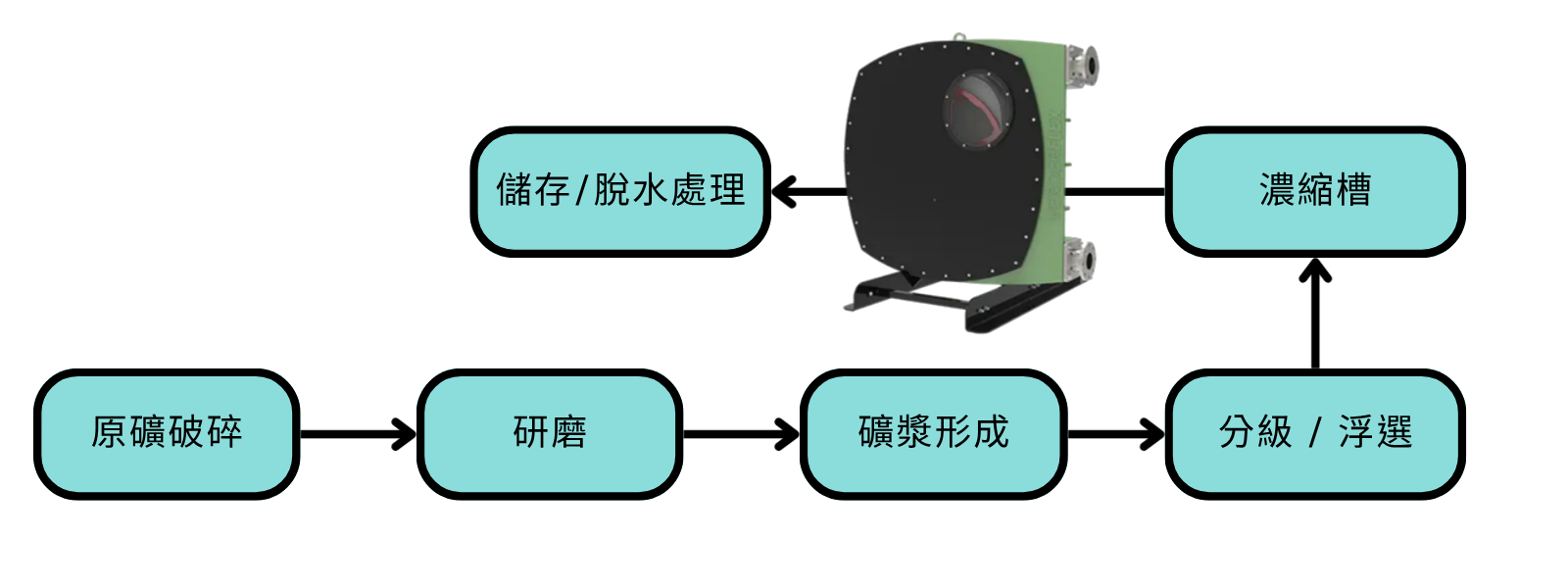 在完成礦物分離後,剩餘的尾礦漿體需被輸送至濃縮槽進行固液分離,再將濃縮後的高濃度漿體輸送至尾礦儲存設施或進一步脫水處理。在此過程中,流體特性極為嚴苛,不僅黏度高、含固率高,且常伴隨不規則顆粒與強烈磨耗性,對傳統離心泵造成嚴重磨損與效率下降問題。
